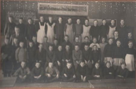 Tredje raden nerifrån från vänster: Lärare Viktor Häggman, Isak Öling, Oskar Kalander, Bruno Aaltonen (Alling), Karl Löfholm, Gunnar Strand, Signe Öling (g. Mattsson), Anna Backlund (g. Sjöström), Alda Kalander (g. Mörk), Brita Frantzen (g. Glader), Ester Öman (g. Kalander), Jenny Sundell (g. Björkbacka).