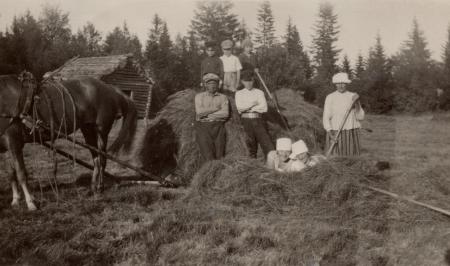 Längst till vänster Erik Heir och Erik Nyman, längst till höger Anna Kock (f. Heir), Anna Finne "Mattus Anna" ligger i höet. De övriga oidentifierade.