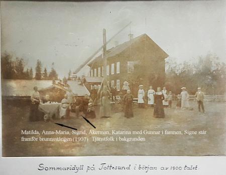 Bilden är tagen sommaren 1907 under arrendator Anders Fors tid. Gösta Forsell har så långt det varit möjligt rett ut vilka persona är. Vid bordet står Matilda bredvid sin mor Anna Maria (sittande). Barnet, Matildas dotter Sigrid, sitter framför bordet. Till höger om bordet sitter lantmätare Alfred Åkerman med hustru. Åkermans son spelar dragspel på källartaket och bredvid sitter Teodor. Till höger om lantmätaren sitter Katarina (Johannes hustru) med sonen Gunnar i famnen. Signe står framför brunnsstången. Deras far Anders Fors "var till stan" och Jenny var sjuk. Längre bak finns tjänstefolk. En del namn finns på fotot.