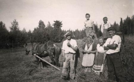 Höbärgning. Längs till vänster Erik Heir och Erik Nyman, längs till höger Anna Kock (f. Heir). Anna Finne ”Mattus Anna” ligger i höet. De övriga oidentifierade.