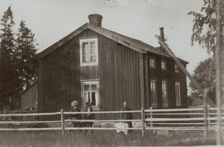 Kalanders backstuga. Katrina Kalander vid hästen och syster Lisa