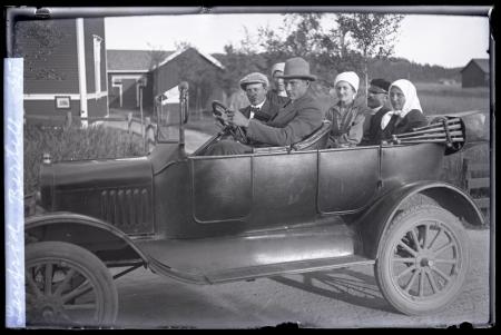 Chauffören är Johannes Nyman från Maxmo, bredvid Edvard Strand och frun Betty, damen i mitten är Anna Kock, Emil Kock och Sigrid Nyman 1925 (Foto sls865_1925_6)