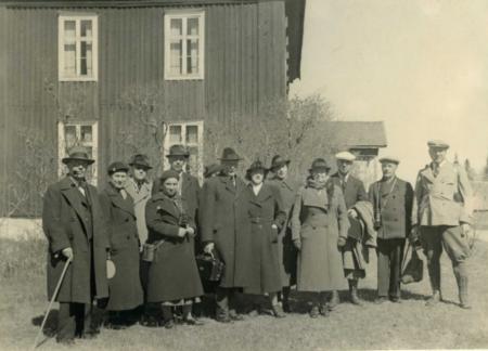 OA:s utfärd till Tottesund 29.5.1939. Från vänster: Brummert, Fru Nyqvist, Ollqvist, Frk. Eriksson, Ehrman, Boucht, Fru Levón, Frk. v. Freyman, Fru Lingonblad, Levón, Tegengren och Birger Lingonblad, som hade antecknat dessa namn under fotot.